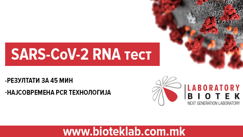 Најсовремена светска PCR технологија за COVID тестирање. Детекција на SARS-CoV-2 вирус преку три генетски секвенци. Изработка за само 20 мин., издавање на резултат за 45 мин. Аплицирајте on-line на https://www.bioteklab.com.mk/vip_covidForm.asp